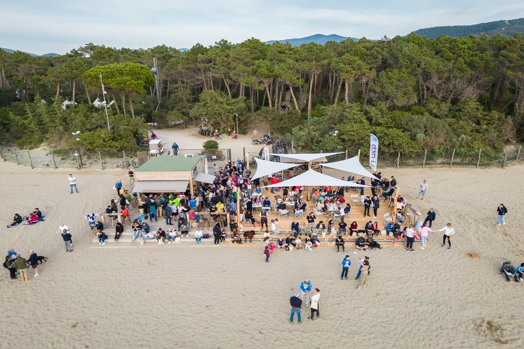 Beach bar sulla spiaggia di Punta Ala con ciclisti e persone che si rilassano dopo il percorso gravel durante l’evento Unpaved Roads in Toscana