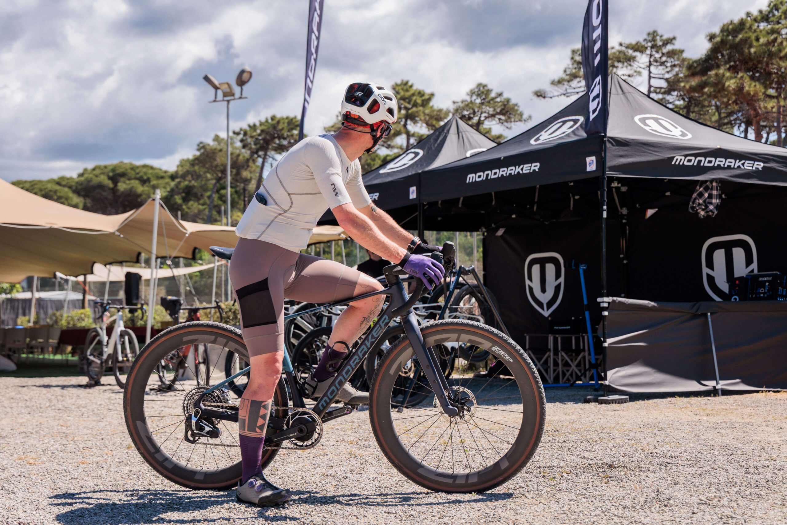 Ciclisti alla linea di partenza dell’evento gravel Unpaved Roads a Punta Ala sotto l’arco Mondraker